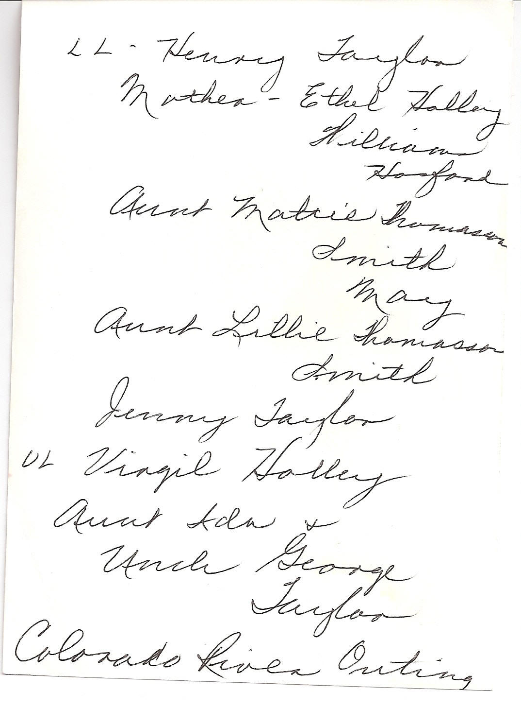 Front Row:  Henry Taylor, Ettie Ethel Holley Williams Hosford, Aunt Matrie Thomasson Smith May, Aunt Lillie Thomasson Smith, Jenny Taylor.